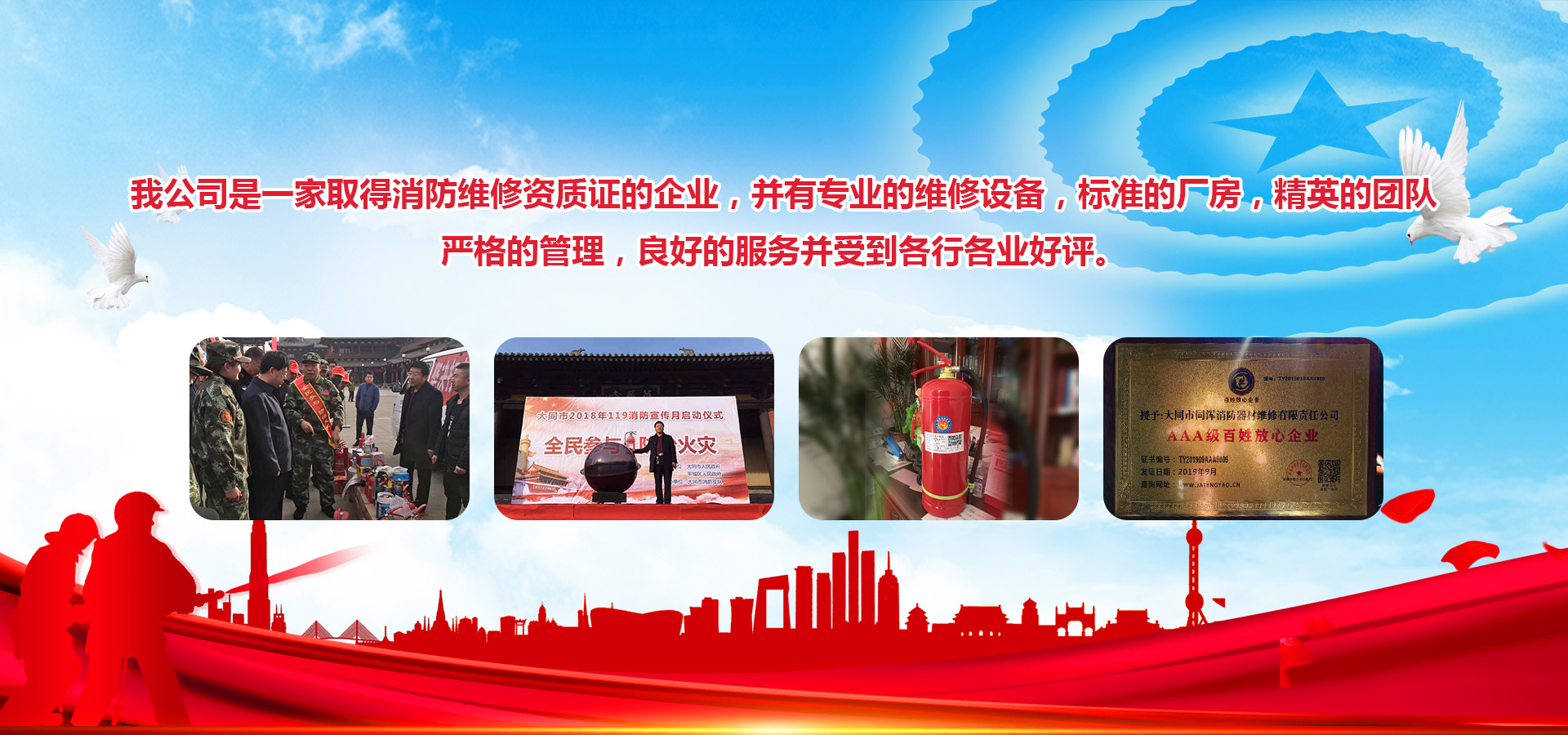 大同市同渾消防器材維修有限責任公司,位于大同市同泉路389號,始建于2000年,是公安部消防局定點銷售和維修的企業,歷經多年的創建、發展和拼搏,現有多家消防器材廠商供應我公司,并有現代化維修設備,標準的廠房,嚴格的管理,優良的設備,良好的服務并受到各行各業的好評??偨浝韯駠栏窆芾恚瑖栏褚螅媲缶J真負責,帶領團隊熱烈歡迎各界朋友顧客光臨。